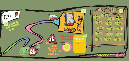 Infine, la tappa di coaching è stato un bel recap di quanto imparato con la promessa che saremmo arrivati poi a Woodstock con un pezzo da suonare sul palco! Ci siamo poi accampati nel Camp e i team dopo aver superato lo “Start” (il finish mi sembrava poco Agile e l’ho cambiato in “start” durante la scrittura di questo post) hanno continuato in autonomia nella scrittura della canzone e dei successivi album!